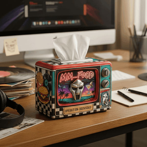 Celebrate hip-hop legend MF DOOM with this “MM…FOOD” Retro TV Tissue Box Holder, a bold collectible that blends everyday utility with underground culture.